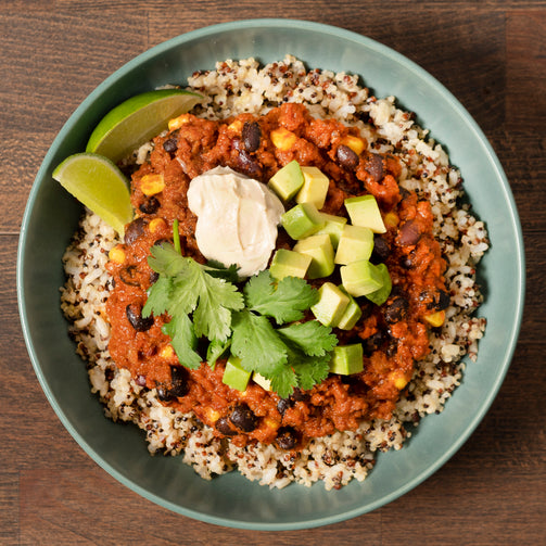 A hearty plant-based Mexican burrito bowl with seasoned beef-style protein and beans, served over wholesome brown rice. Packed with bold flavours and balanced nutrition, it’s a satisfying ready meal made easy.